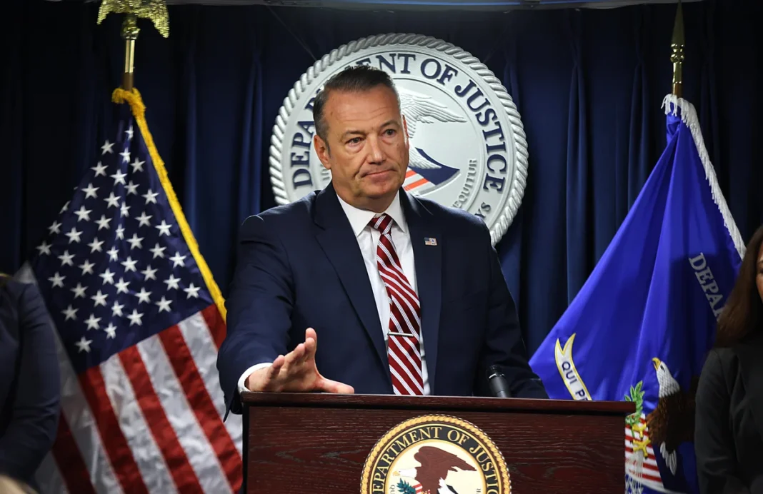Todd Lyons, acting director of U.S. Immigration and Customs Enforcement, speaks at a press conference at the John Joseph Moakley United States Courthouse in Boston on June 2, 2025.