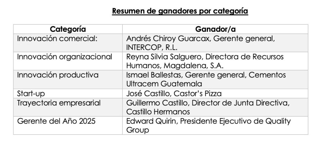El galardón ha reconocido a destacados líderes como: Juan José Gutiérrez (Pollo Campero, 2005); Yolanda de Cofiño (McDonald’s, 2006); Diego Pulido (Corporación BI, 2007); Diana Canella (Canella, 2010); Jacobo Tefel Farrer (Fogel Centroamérica, 2011); Carmelo Torrebiarte (Grupo Cobán, 2013); Enrique Neutze Aycinena (Aseguradora General, 2014); Connie Beneitez de Paiz (2018); Juan Niemann (2020); Héroes de la pandemia (2021); Carlos Guzmán (2022); Roberto Way Menéndez (2023); y Tomás Rodríguez Schelesinger (2024).