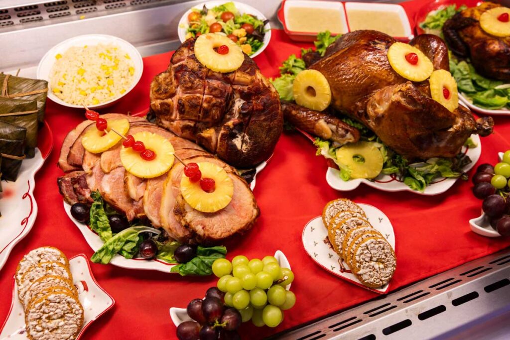 Las opciones disponibles incluyen pavo cocinado, pierna horneada, tamales de cerdo o pollo y pollo rostizado, acompañados de guarniciones tradicionales como arroz, puré de papa, ensalada verde, magdalena, ponche, salsa navideña y pan. Los precios de los combos varían según las selecciones de cada familia, permitiendo personalizar su cena de acuerdo con sus gustos y necesidades.
