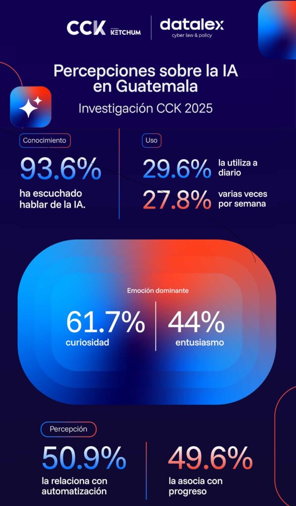 Guatemala. La firma regional de comunicación estratégica y relaciones públicas, CCK Centroamérica en alianza con Datalex Latam, presentó los resultados para Guatemala del estudio regional “Percepciones sobre el uso de la inteligencia artificial en las empresas”. Los guatemaltecos muestran una postura positiva ante la inteligencia artificial (IA), combinando altos niveles de adopción tecnológica y una confianza creciente en su aplicación dentro del entorno empresarial.