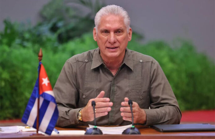 Al referirse a Cuba, el gobernante cubano recordó que el país ha estado durante seis décadas bajo un intenso bloqueo por parte de Estados Unidos, que ataca a todos los sectores de la sociedad cubana, el bloqueo más severo y prolongado de la historia, además de la inclusión de Cuba en la lista de países patrocinadores del terrorismo, lo cual hace más difícil la situación del país. Díaz-Canel Bermúdez llamó a Estados Unidos a suspender y levantar las medidas coercitivas unilaterales aplicadas contra Cuba.