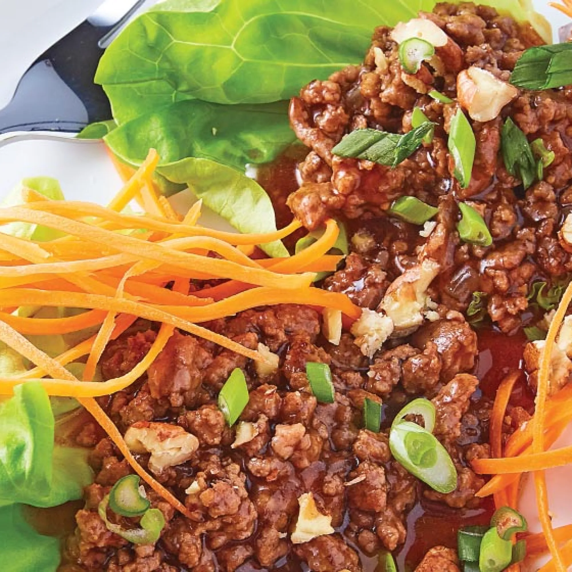 - Saltea la carne molida en una sartén con aceite de ajonjolí, cuando dore agrega soya, salsa koisin, arándanos y nuez troceada.