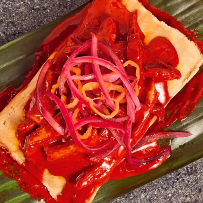 - Unta masa en el centro de una hoja de plátano. Agrega carne de cerdo y salsa de cochinita pibil; cierra el tamal. Continúa hasta terminar.