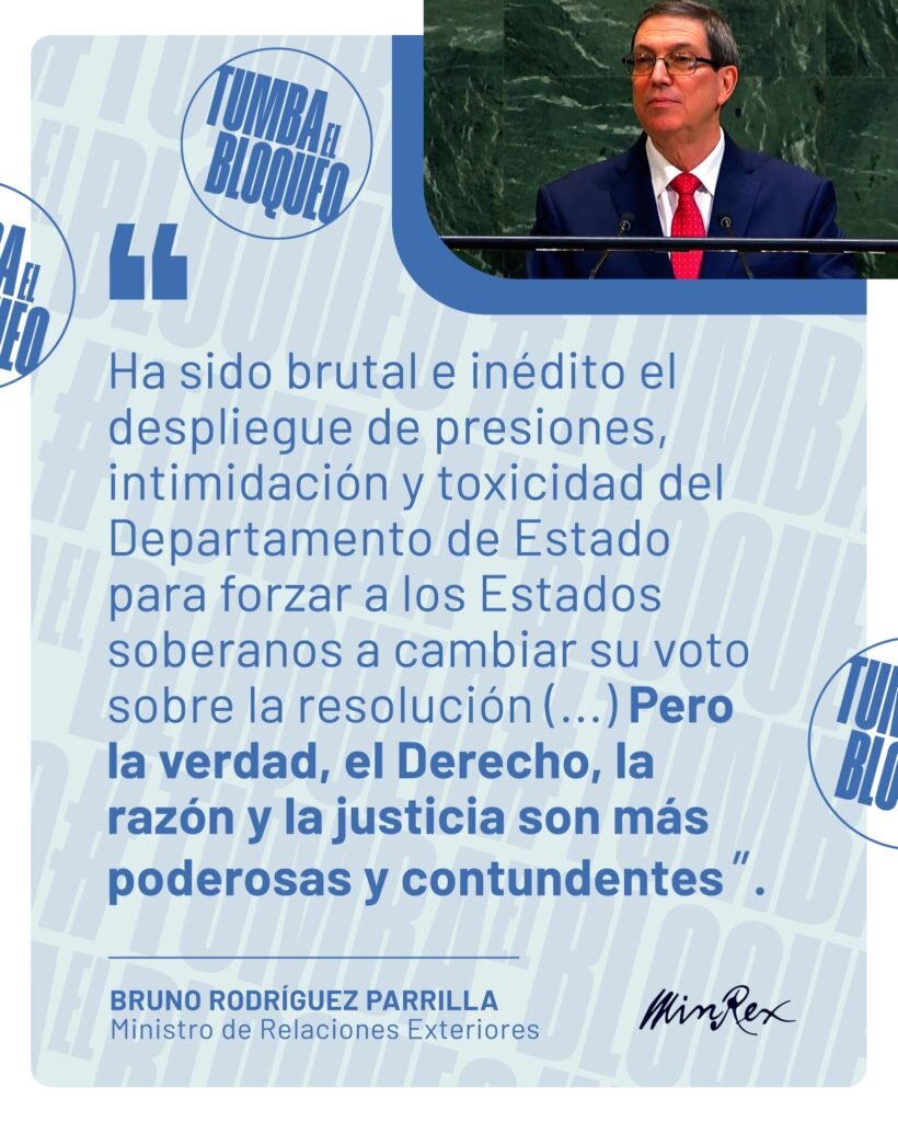 El canciller cubano, Bruno Rodríguez Parrilla agradeció a los países que alzaron su voz para pedir el fin del bloqueo a Cuba y la salida de la lista de Estados patrocinadores del terrorismo, así como a los cubanos y organizaciones que se pronunciaron con acciones solidarias y patrióticas.