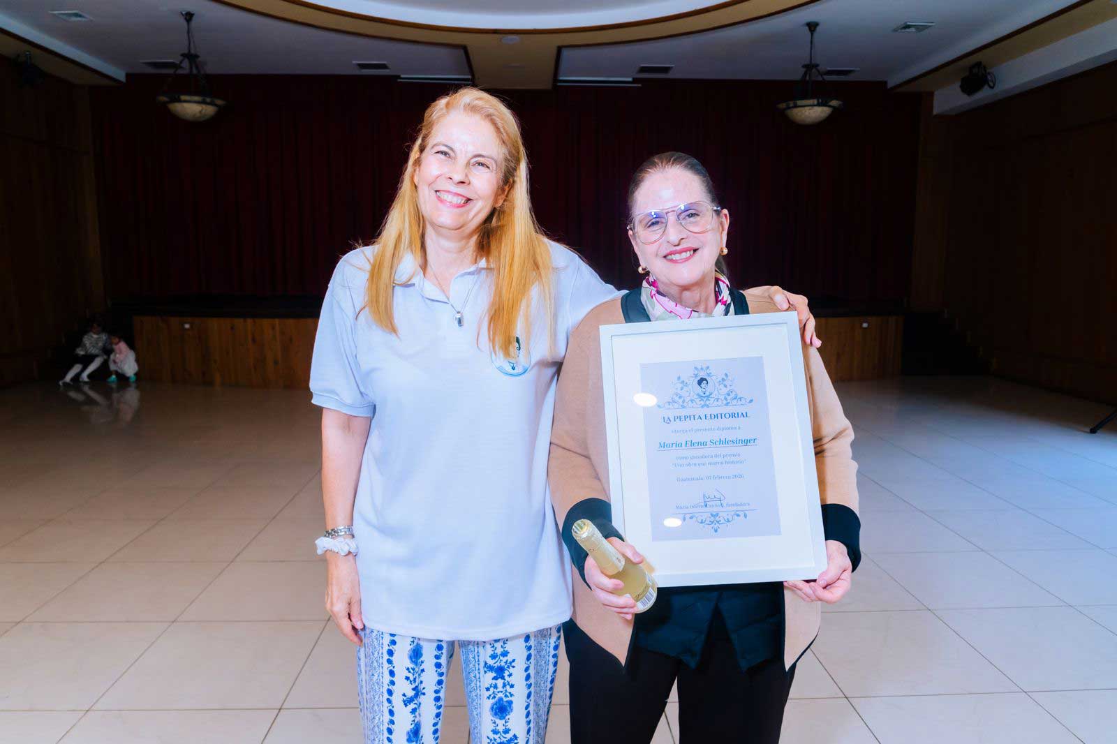 Guatemala. La Pepita Editorial otorgó el reconocimiento “Una obra que marca historia” a la escritora y periodista María Elena Schlesinger, por su obra Memorias de un conejo, en un acto realizado el sábado 7 de febrero en el Club Alemán Von Humboldt.