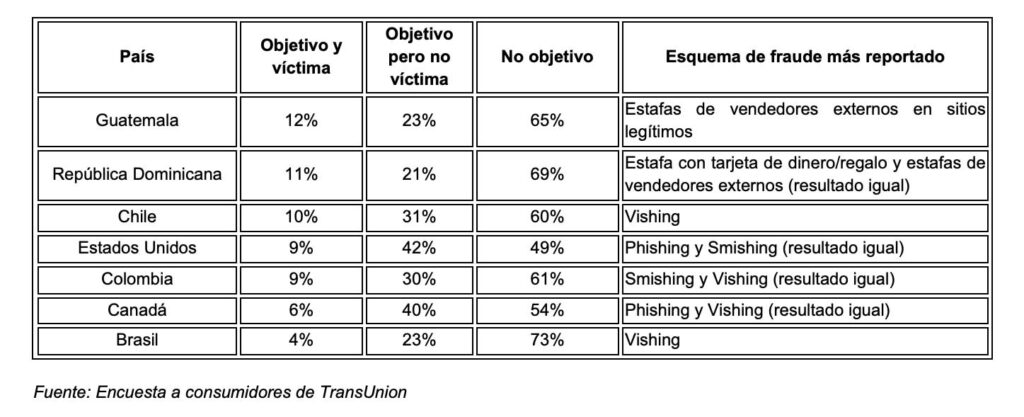 Según el más reciente Informe de TransUnion sobre las Principales Tendencias de Fraude, Guatemala tuvo el mayor número de encuestados entre los países analizados en el continente americano, que dijeron haber sido víctimas de fraude por correo electrónico, en línea, llamadas telefónicas o mensajes de texto entre febrero y mayo de 2025. Entre quienes dijeron haber sido objetivo, los esquemas de fraude más reportados tuvieron los mismos resultados entre estafas con tarjetas de dinero/regalo y estafas de vendedores externos en sitios web legítimos.