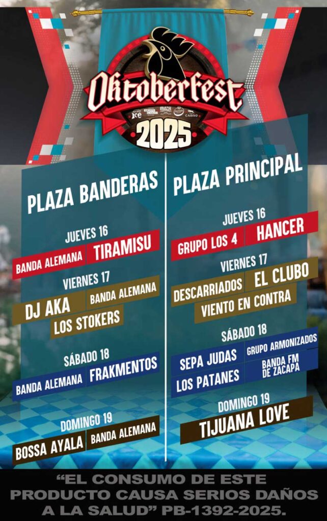 Paralelamente, la Plaza Principal se convertirá en el corazón musical del festival con una cartelera de lujo: el jueves 16, los asistentes podrán disfrutar de Grupo Los 4 y Hancer, en una noche inaugural llena de energía y talento nacional. El viernes 17, el escenario vibrará con Descarriados, El Clubo y Viento en Contra, tres agrupaciones que garantizan una jornada de rock y conexión con el público. El sábado 18 será una explosión de ritmos con Sepa Judas, Grupo Armonizados, Los Patanes y la emblemática Banda FM de Zacapa, llevando la fiesta a su punto máximo. Finalmente, el domingo 19, la banda Tijuana Love pondrá el broche de oro con su estilo vibrante, acompañada por el encanto de Bossa Aya la y la tradicional Banda Alemana, cerrando el Oktober Fest con un mensaje de unión, música y celebración para todos.