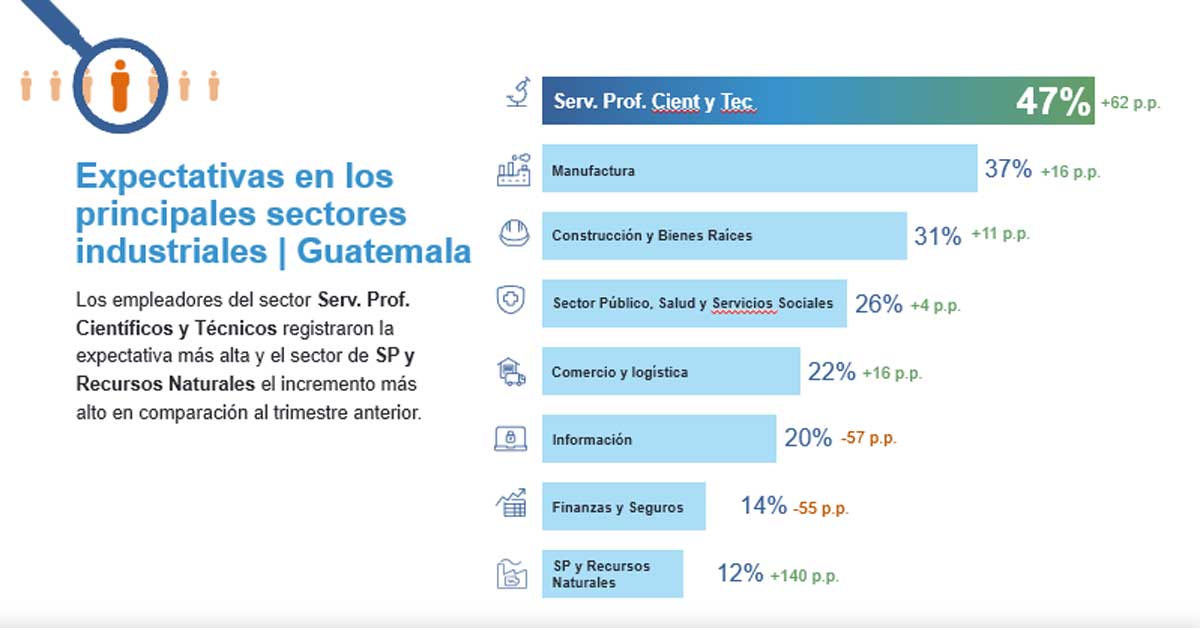 Guatemala se posiciona en el 7° lugar a nivel global por sus perspectivas de empleo, superando en 4 puntos porcentuales el promedio mundial. “Este resultado refleja la confianza y visión de crecimiento de los empleadores guatemaltecos, quienes apuestan por la expansión y la generación de nuevas oportunidades. El dinamismo es especialmente evidente en los Servicios Profesionales, Científicos y Técnicos, así como en la Manufactura, sectores que marcan el pulso de un mercado laboral activo y con gran potencial de desarrollo”, afirmó Ricardo Gálvez, Country Manager de ManpowerGroup Guatemala.
