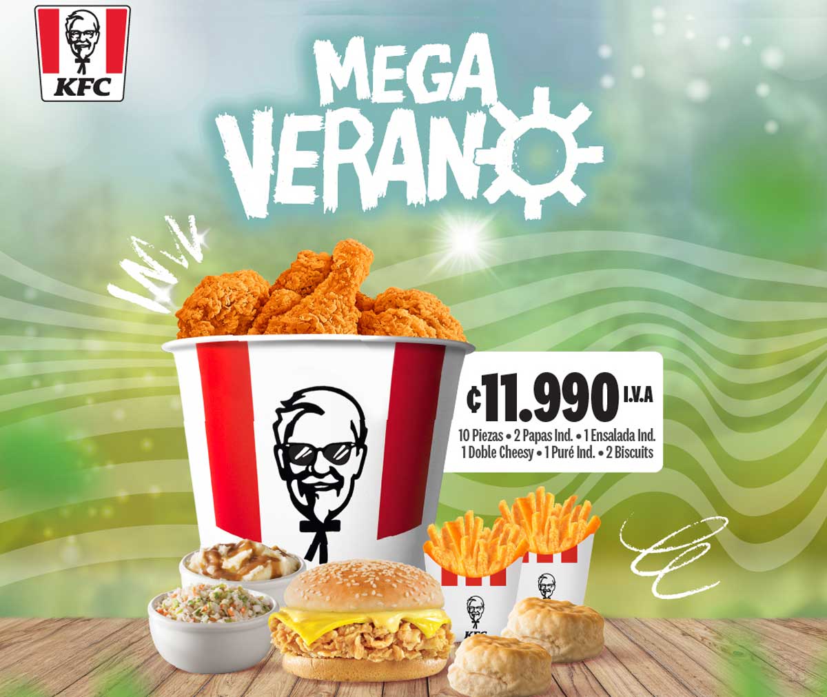 La propuesta está compuesta por 10 piezas de pollo, 2 papas individuales, 1 ensalada individual, 1 hamburguesa Double Cheesy, 1 puré individual y 2 biscuits, con un precio de ₡11.990 colones. Su formato responde a las dinámicas del verano, en las que los consumidores priorizan practicidad, conveniencia y opciones que permitan compartir.