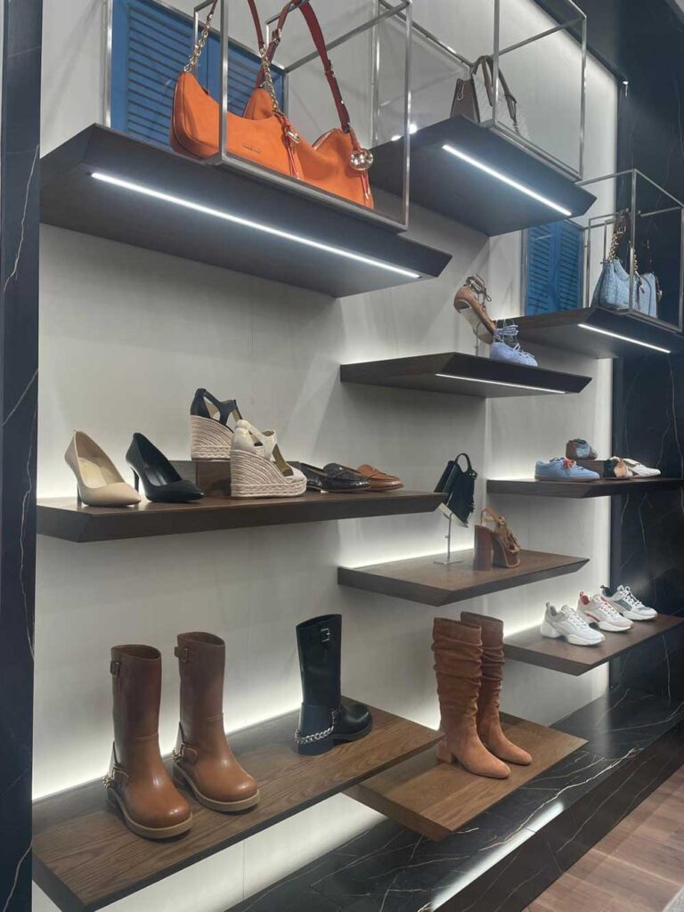 La nueva tienda Michael Kors refleja el compromiso de la marca con el lujo relajado, con un énfasis en la comodidad y la sofisticación. Los clientes son recibidos en un ambiente cálido, con suaves tonos neutros, detalles decorativos que evocan un hogar y una atmósfera abierta y luminosa, realzada por estanterías flotantes e iluminación vibrante. El ambiente invita a los clientes a explorar, comprar y disfrutar del estilo y servicio excepcionales de la marca.