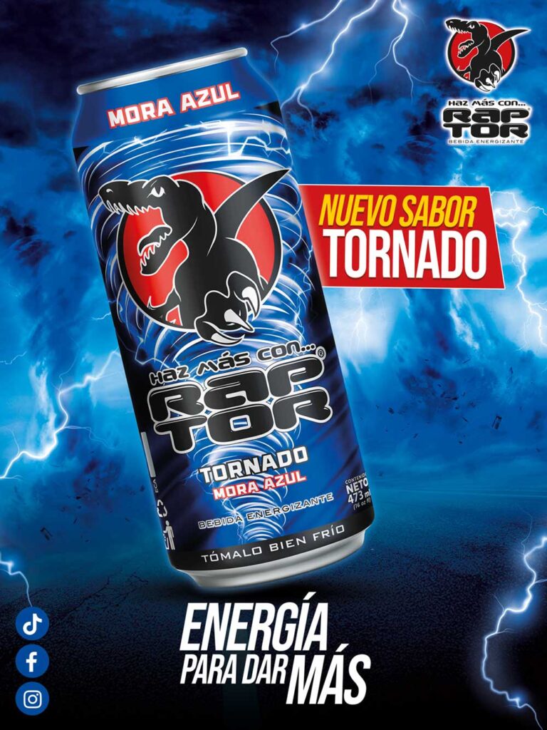 Durante esta temporada, Raptor acompañará el lanzamiento con activaciones especiales, degustaciones, presencia en eventos de verano y colaboraciones con influencers afines a su estilo energético y atrevido, ampliando su alcance en entornos presenciales y digitales. El producto se presenta en lata de 473 ml, con un diseño renovado que resalta tonos vibrantes y elementos gráficos inspirados en el concepto Tornado.