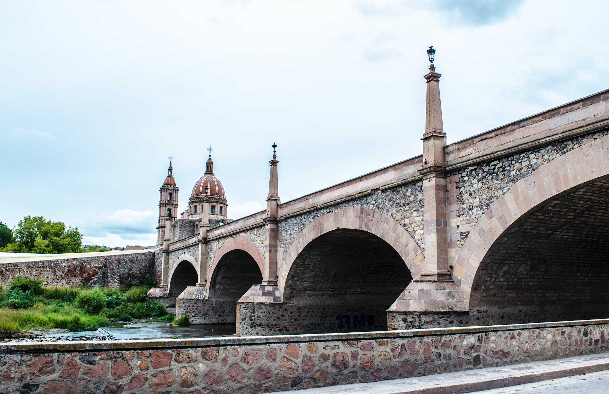 La magnífica construcción del Puente del Río Lagos consta de cuatro arcos de cantera y se caracteriza por su esculpido tallado de la cantera y la firmeza de sus cimientos, el cual fue inaugurado en 1860 para facilitar el cruce del río. Pero el costo de su edificación fue más alto de lo esperado por lo que decidieron poner un impuesto a todo aquél que transita en él por lo que la gente optaba por pasar por el río, por esa razón, en modo de burla, el alcalde mandó colocar la placa que dice: “Este puente se hizo en Lagos y se pasa por arriba.”