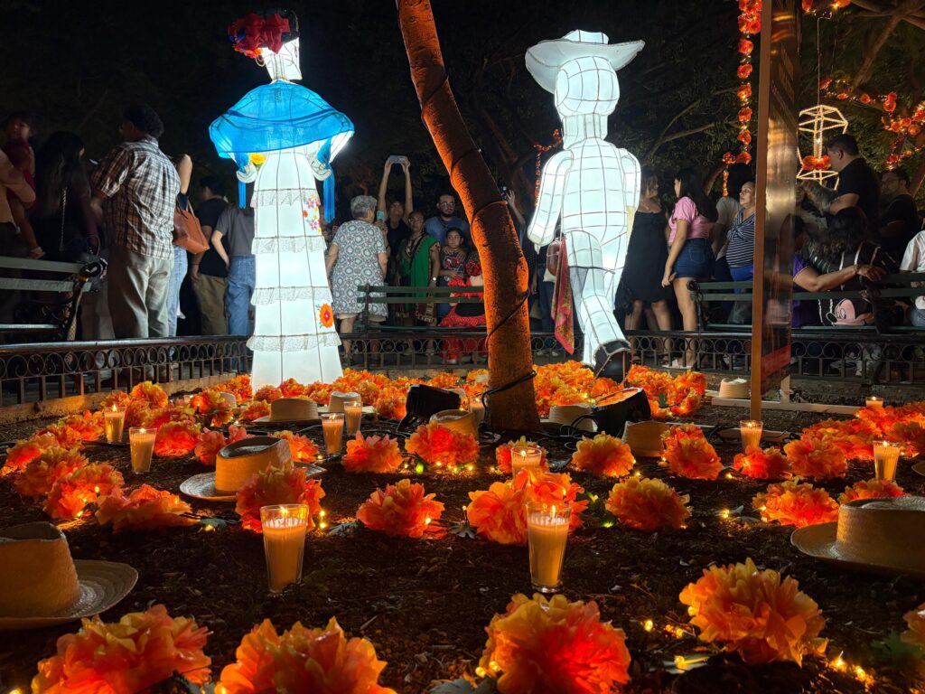 En esta edición, el parque de San Juan luce 19 figuras monumentales iluminadas, entre calaveras, catrinas, flores de cempasúchil y altares tradicionales que invitan a recorrerlo al caer la noche.