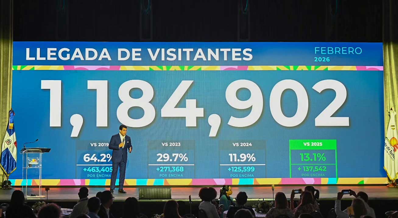 Dijo que la llegada de 1,184,902 en febrero, representa un crecimiento de un 13.1% con relación al mismo mes del 2025, un 11.9% respecto al 2024 y un 64.2 frente al 2019.